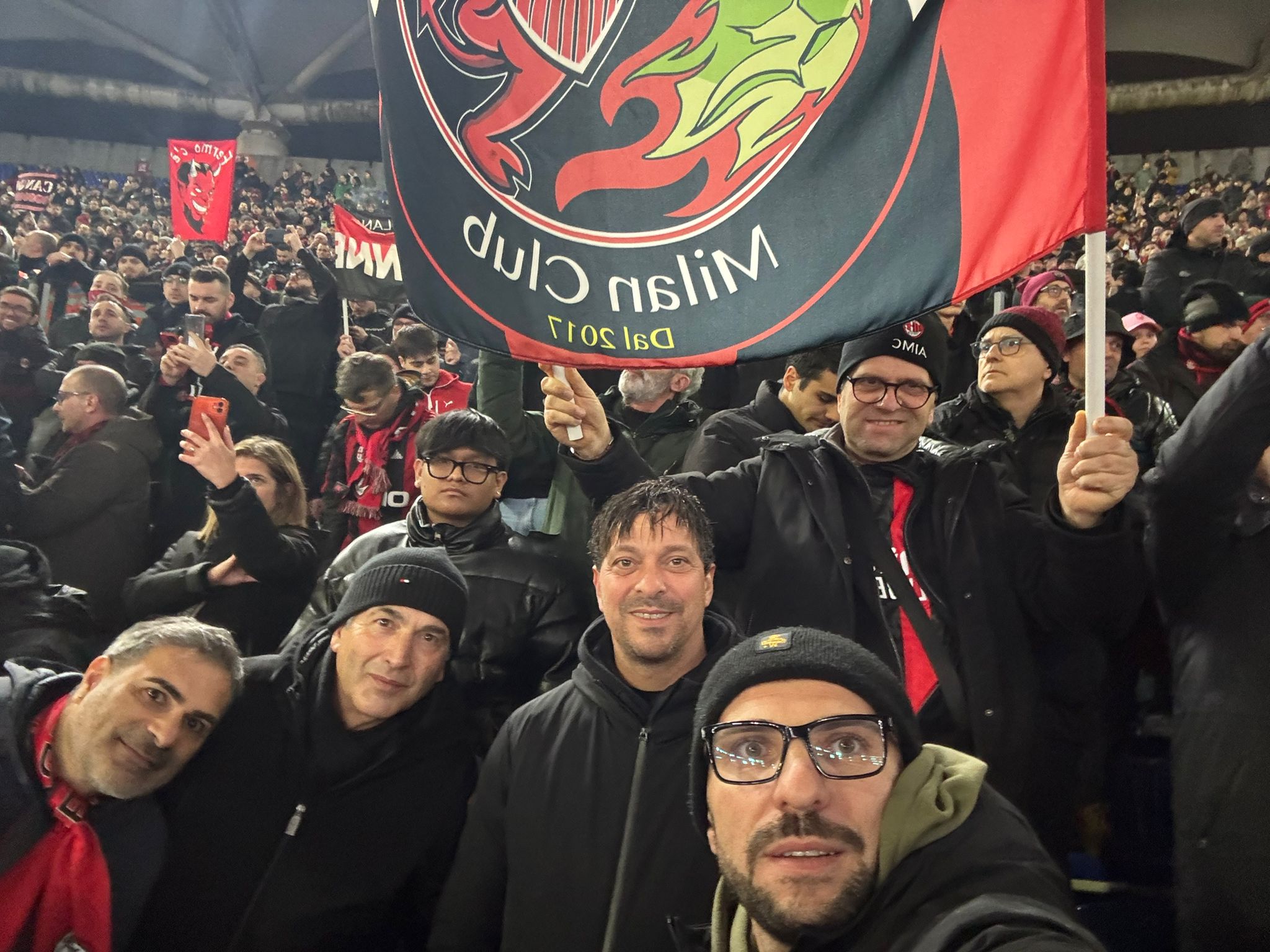 Un gruppo compatto di soci e tifosi ha colorato di rossonero le tribune dell’Olimpico, portando con orgoglio bandiere, sciarpe e striscioni del Club, testimoniando ancora una volta quanto l’amore per il Milan sappia unire persone, generazioni e territori diversi.